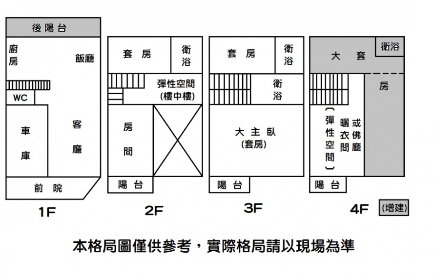 2. 傳統格局正樓中樓,挑高客廳,前後皆可出入,有四間套房(含頂樓增建1套)+1雅房